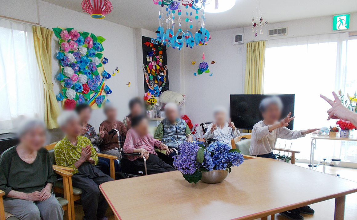 たのしい家神奈川三枚町の今月は「あじさい鑑賞」です。 しかし、”あじさい”鑑賞の予定日はあいにくの雨模様。 でも、今年は例年よりも”あじさい”の色がくっきりと 鮮やかな色彩を放っておりました。 そこで、当日は皆様で記念撮影をしたり、散歩の方は日にちを変更してお出かけしたりと 各々のご希望に応じて鑑賞してまいりました。 フロアーには皆様で作り上げた”あじさい”を飾り 「ハイ!チーズ」、じめじめとした空模様とは打って変わり 皆様元気で過ごされた数日間でした。