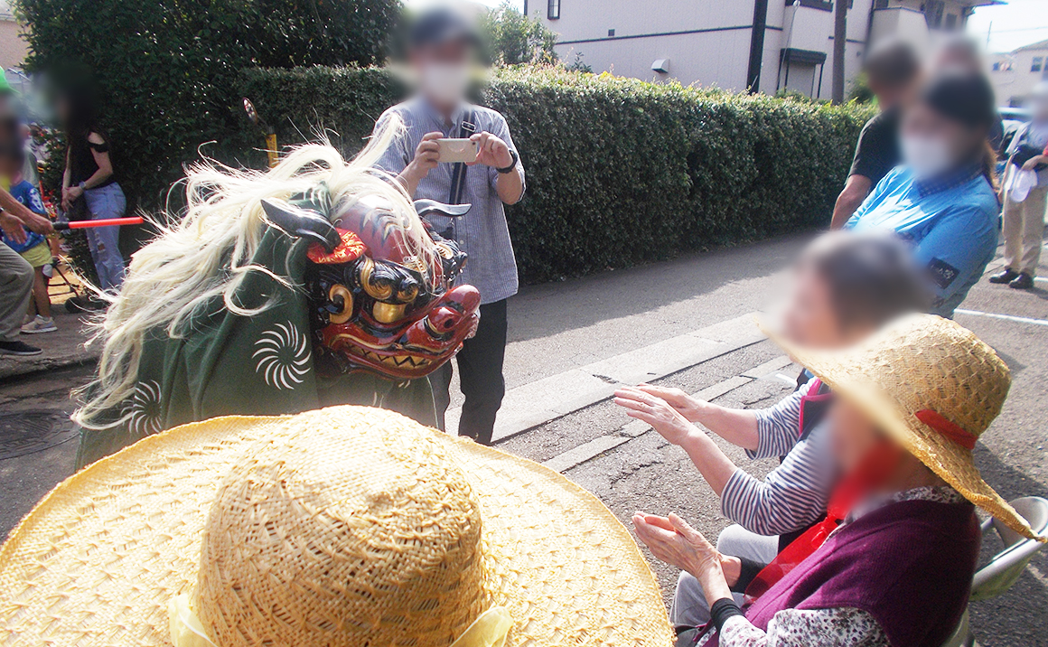 新型コロナウイルスの影響で中止になっていた自治会のお神輿が4年ぶりの再開となり利用者様と家族様で参加してまいりました。 久々に子供たちが担ぐお神輿、そして獅子舞にご利用者様とご家族様も大喜びでした。 ご利用者様の皆様は近隣の方々との交流、そして子供たちとのコミュニケーションでいつもとは違った笑顔を見ることが出来ました。