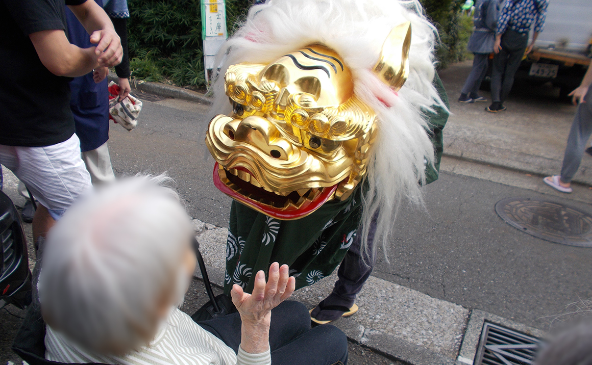 すると後ろから獅子舞も現れ、キレのいい踊りを踊ってくださり、ご利用者様全員に噛みつかれ、無病息災を願っていただけました。