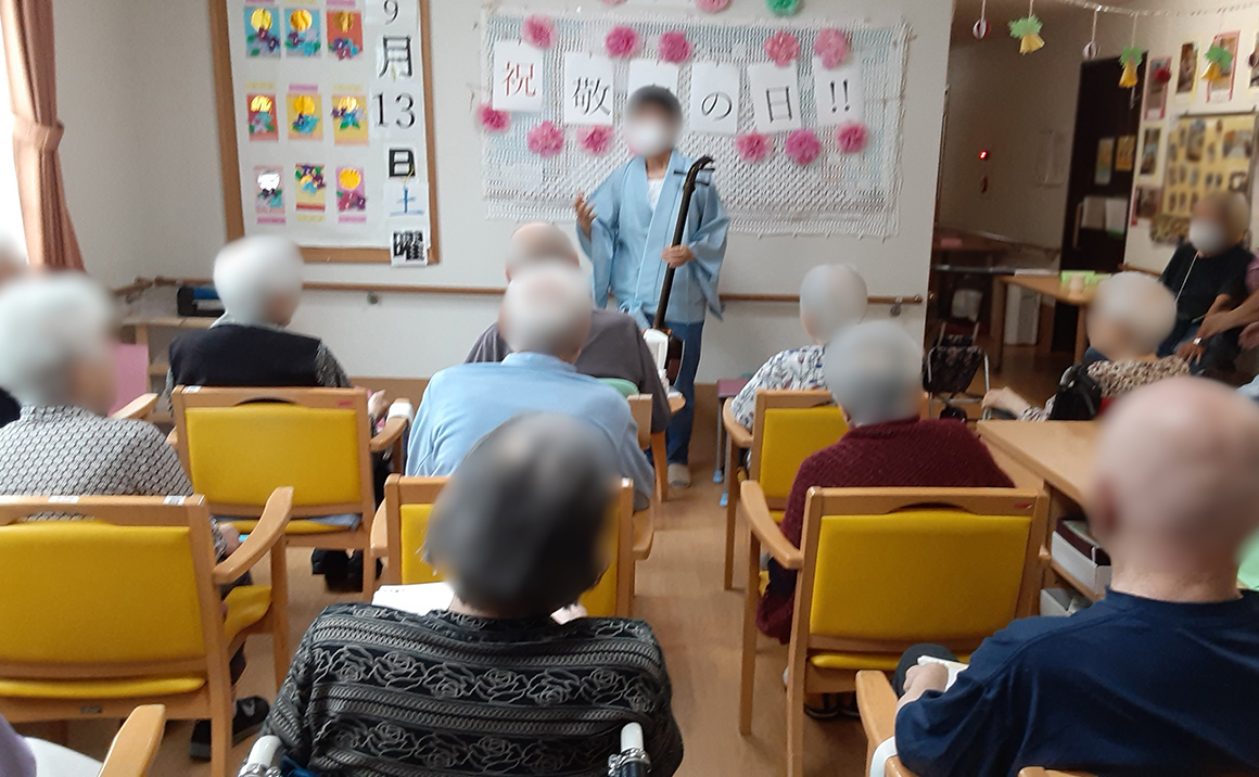 敬老の日のイベントで、三味線とハーモニカ演奏を楽しみました。