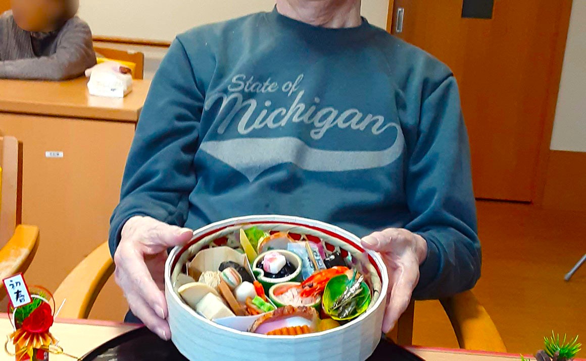 あけましておめでとうございます。 たのしい家川崎宮前では1月1日に年始のお祝いを行いました。 皆様おせち料理を嬉しそうに、美味しそうに召し上がり、 とても楽しい年の始まりとなりました。 皆様今年もよろしくお願いいたします。
