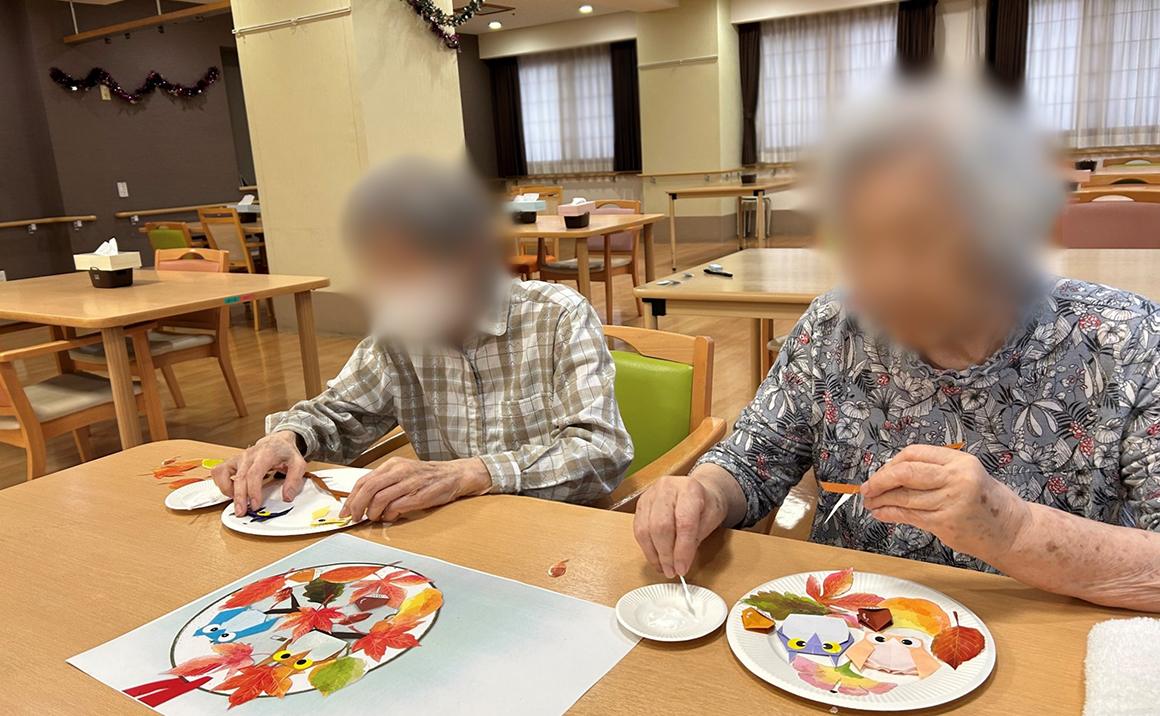 プレザンメゾン八王子高倉では、秋にちなんだ工作のレクリエーションをおこないました。 折り紙で折ったフクロウや、木の枝、葉っぱ、栗や団栗などを丸い紙皿に貼って頂きました。 職員が作った見本に忠実に貼られる方、お好きなように貼られる方、慎重に考えながら貼られる方など それぞれの個性を活かしながら、皆様楽しく、そして真剣に取り組まれておりました。