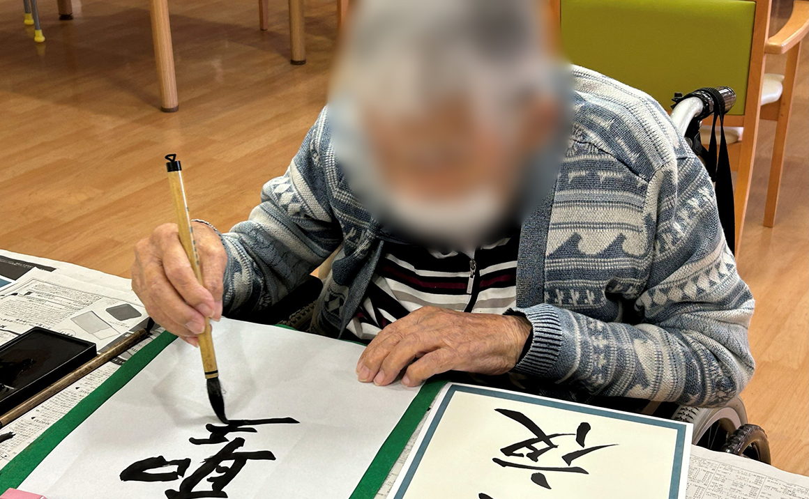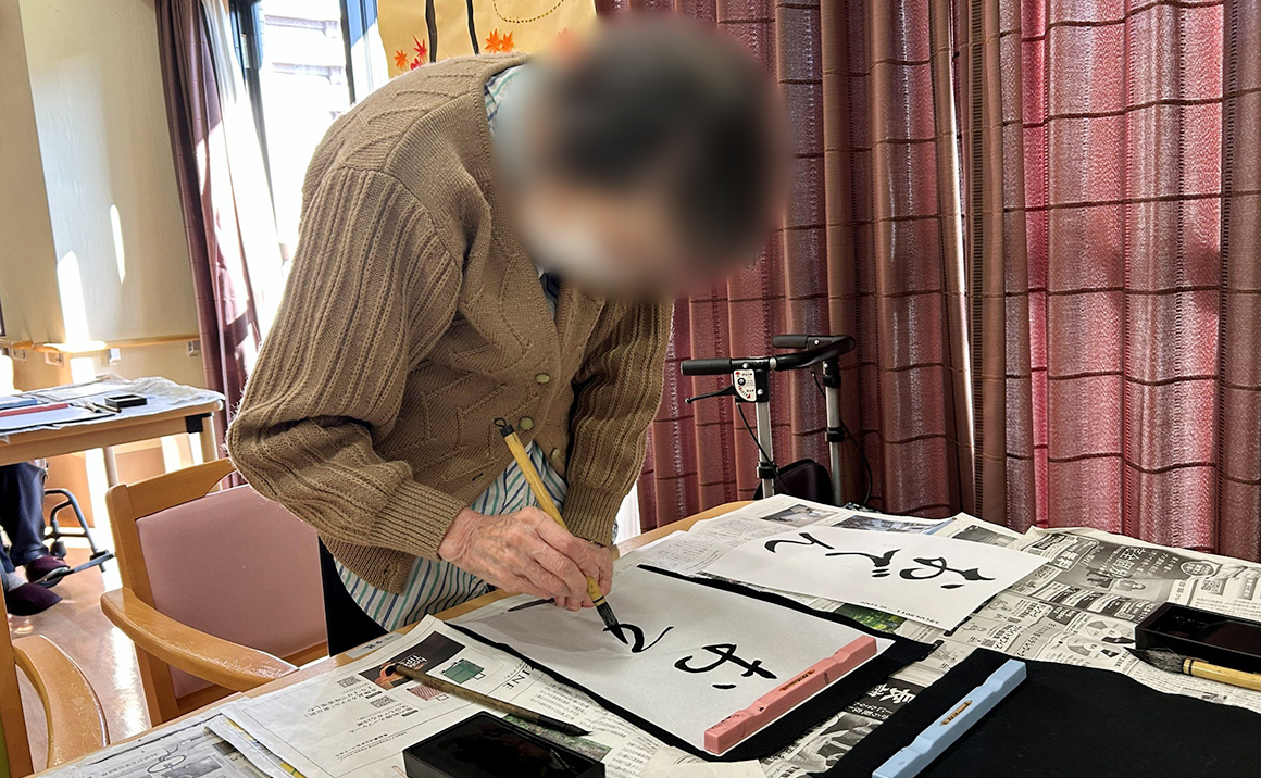 11/28(金)は毎月恒例の「書道サークル」の日でした。 今月のお題の中からお好きな文字を選んで頂き、 納得がいくまで書き直される方、1発勝負で1枚だけ書いて帰られる方、 何種類も書いて下さり、どれを飾るか選んで下さる方など 様々です。