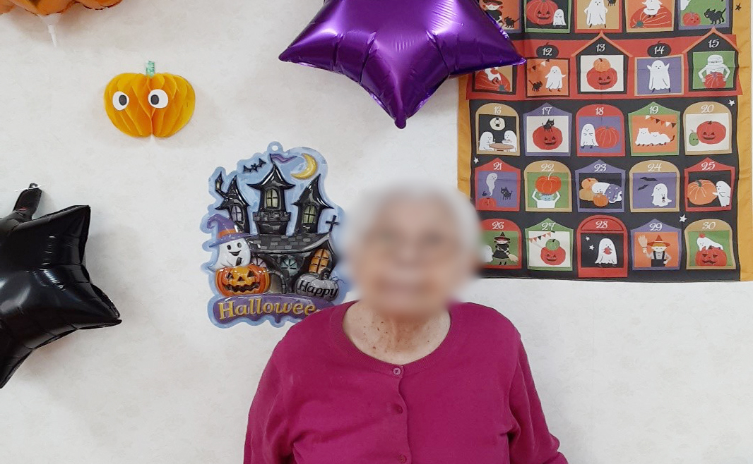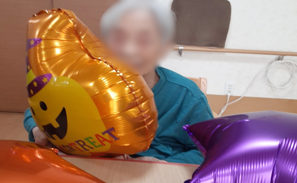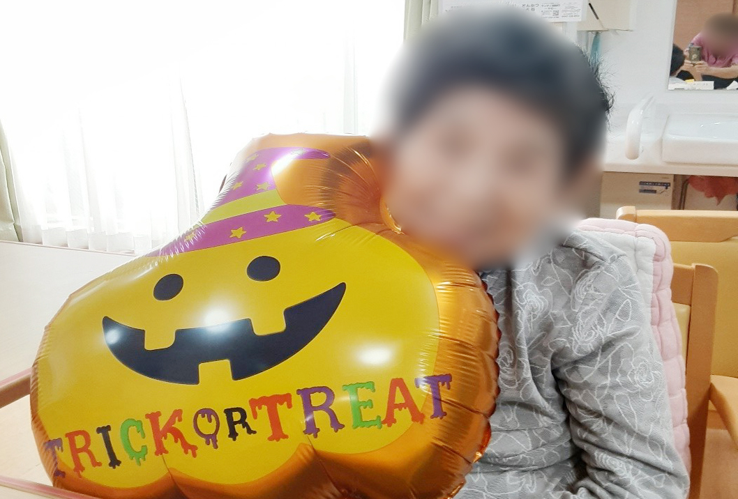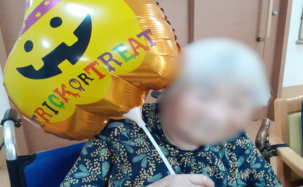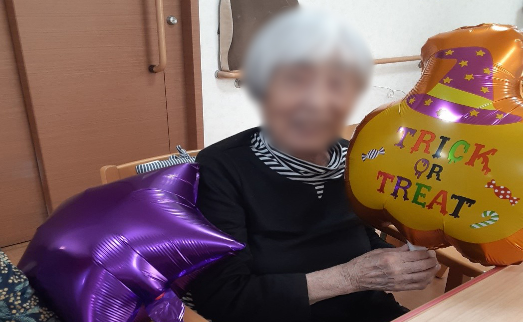 10月はハロウィーンの気分を味わう為に、リビングの飾り付けをしました。 皆様にはあまり、馴染みがないようで飾り付けを見ても最初は反応が薄く… 職員がこんなイベントですと説明すると、「何だか楽しそうね」と笑顔で記念撮影を行いました。