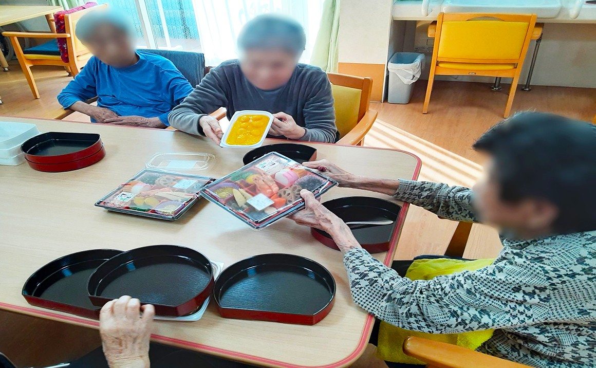 明けましておめでとうございます。本年も宜しくお願いいたします。 たのしい家本八幡では元旦におせち料理を皆様で盛り付けを行い、召し上がって頂きました。 盛り付け中は、つまみ食いもみられ笑顔多く、楽しく行ってました。