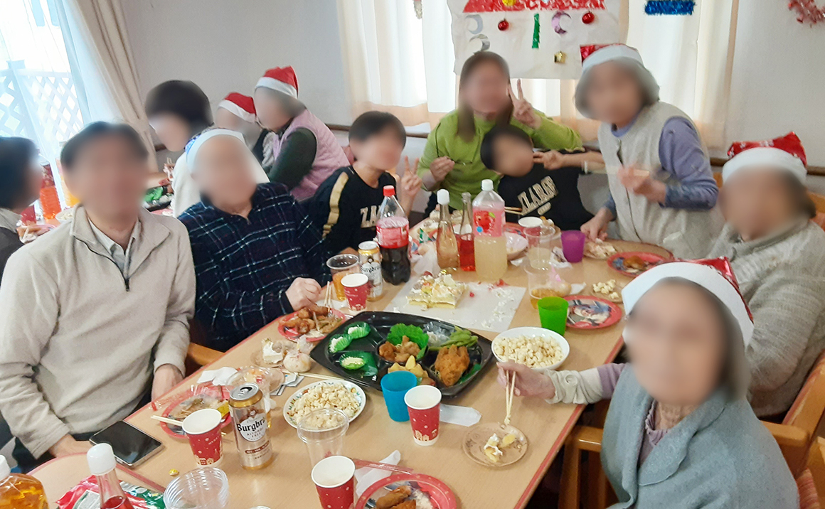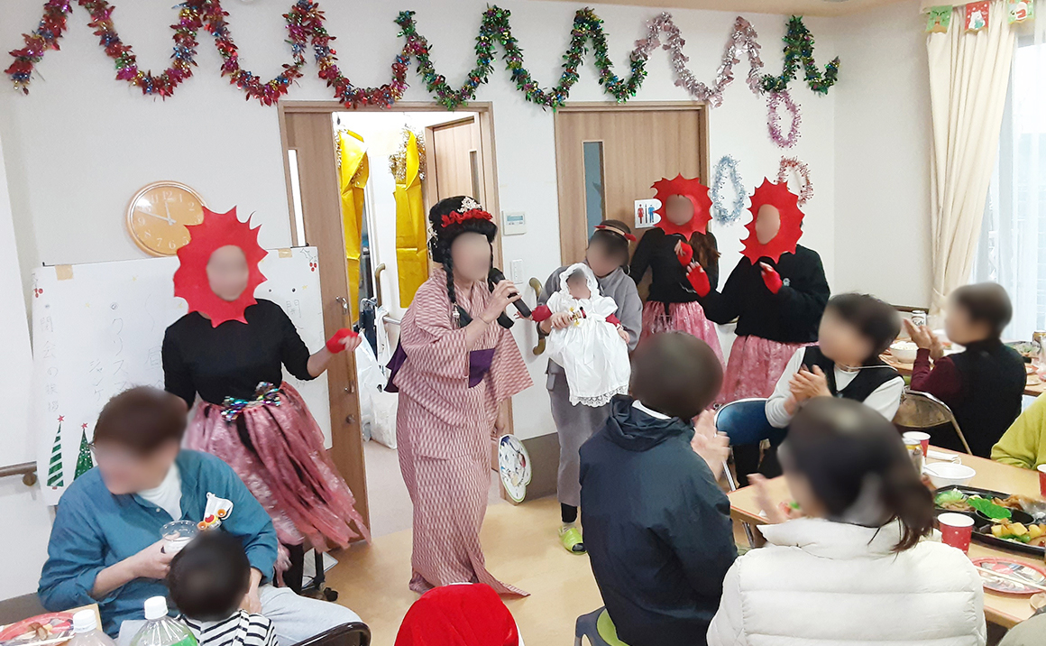 職員の出し物、ご家族様とハンドベルの演奏、じゃんけん大会等、 とても盛り上がりました。 入居者様はご家族様と楽しい時間を過ごし、 職員も張り切って出し物を披露しました。 とても楽しいクリスマスパーティーになりました。