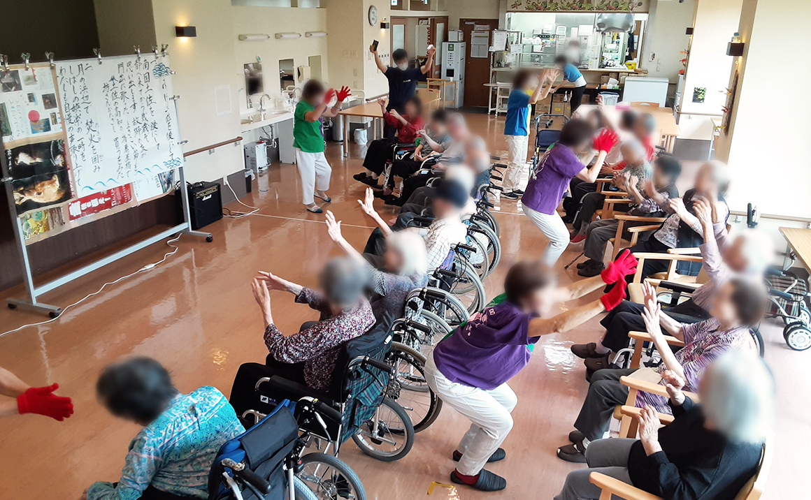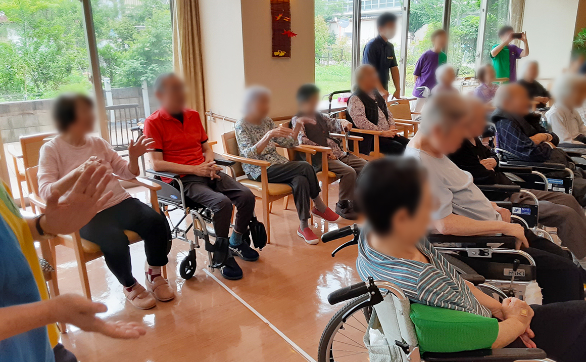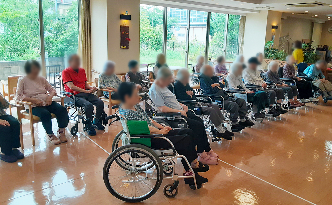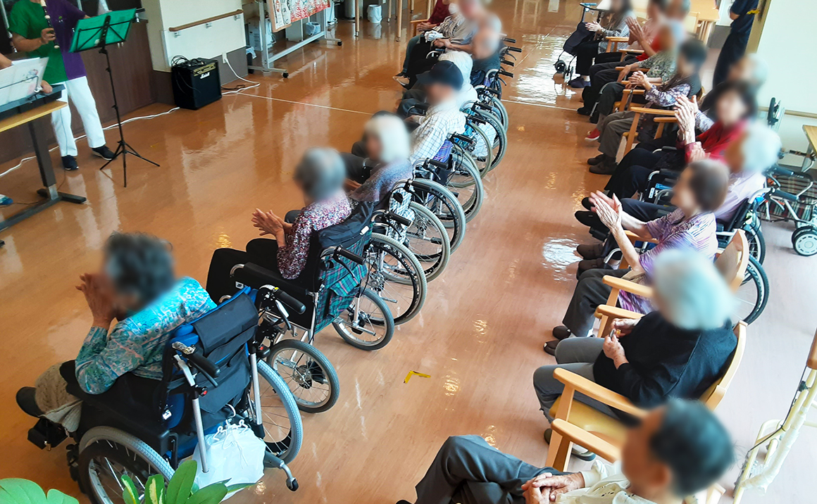 今回のイベントは、歌と楽器演奏の発表会を行いました。 総勢17名のご利用者様が食堂に集まり参加され、歌を歌ったり体を動かしたりされ 楽しい時間を過ごされていました。