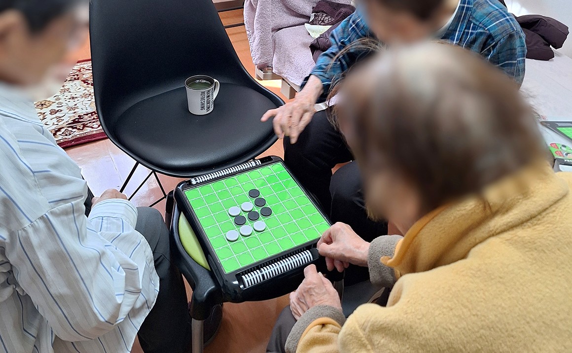 同じフロアのご利用者様のお部屋でお茶を召し上がり 真剣に考えていたり わいわい言いながらオセロを楽しんで いらっしゃいました。 オセロ初心者の方もいらっしゃり「この歳でなかなか覚えるの大変!」 と笑顔で話されていました。