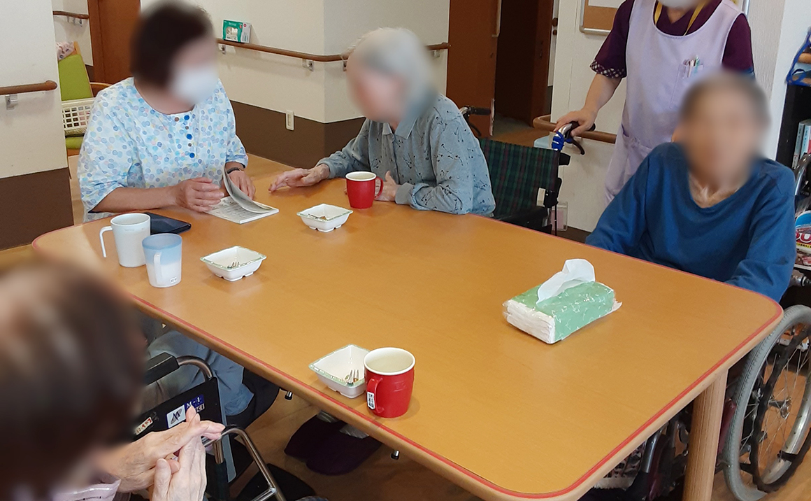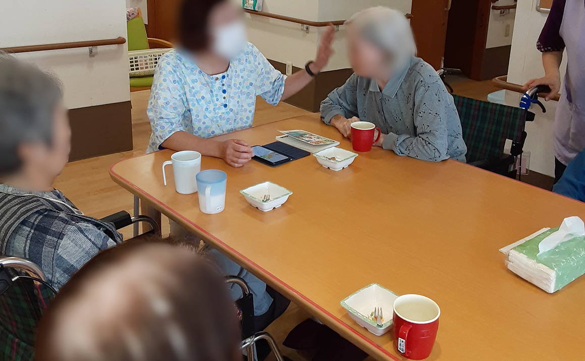 おかあさまと他のご利用者様とでテーブルを囲みながら歌を歌ったり 世間話をしたりと楽しいひと時をいつも提供して下さって 感謝しています。 先日は大きなサイズのトランプを持ってきて下さり 自分の目で確認できる事で皆様のやる気も倍増でした!