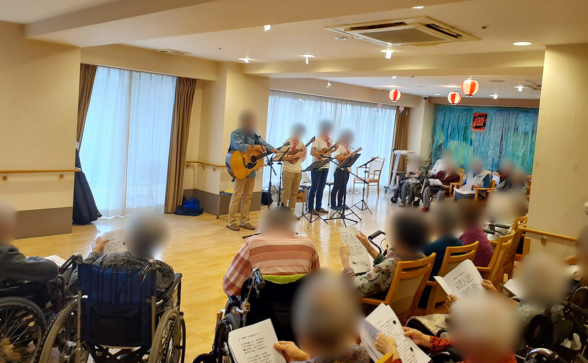 軽やかなギターとウクレレの音色が会場を包み込み、その音色に合わせて入居者様の歌声が響く、和やかで素敵なひと時を過ごす事が出来ました。