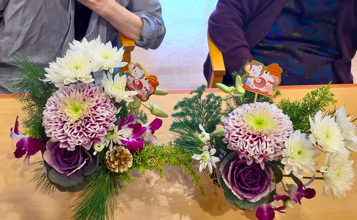 当日、お花を見た入居者様は、華やかなお花ねと喜ばれていらっしゃいました。花の名前や説明を受けた後は皆様それぞれに生けていただき、最後に2026年の干支である午年のピックを差して完成となりました。お正月らしい華やかなアレンジメントですよね。