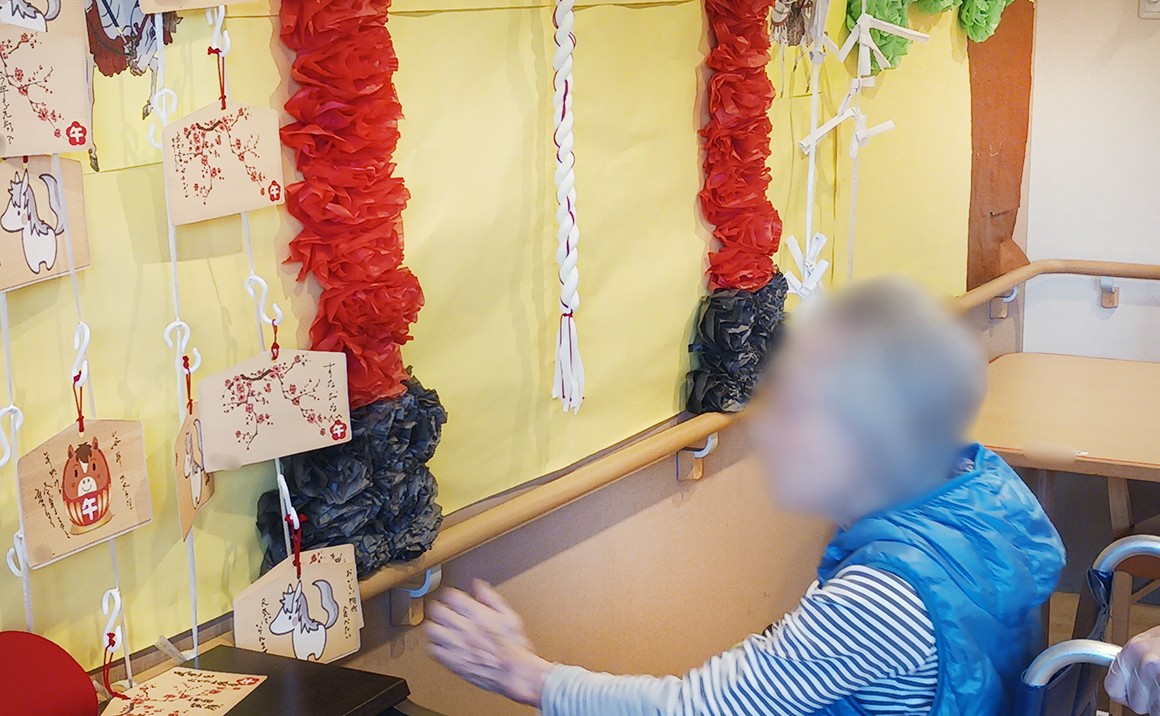 外は寒く、なかなか散歩に出られない季節ですが、施設の中でもお正月らしい雰囲気を楽しんでいただけるように工夫しました。