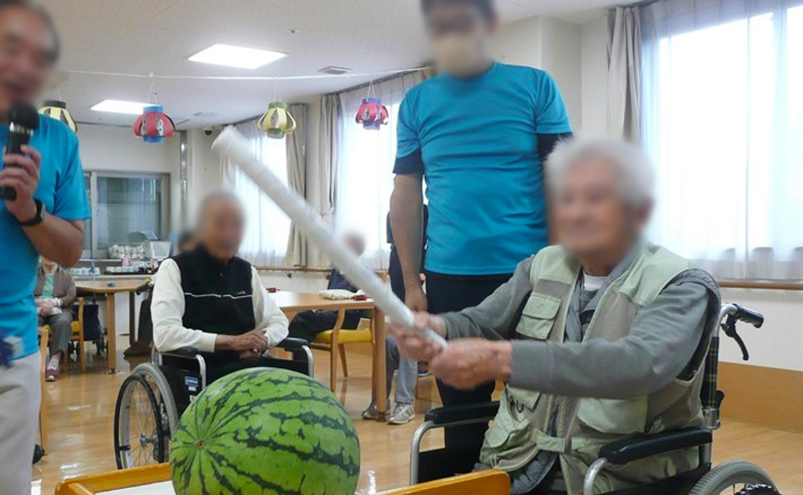 まずは景気づけに一杯🍺🍺🍺ぷは~~ぁ🍺 ノンアルビールもラムネもしみるぜぃ。 普段はなかなかお茶が進まない方々もグイグイいきます。 なぜなら。今日は納涼祭だから。 スタッフの余興も盛り上がるけれどなんてったって西瓜割り🍉 見たことない形相で、信じられない力強さで一心不乱にこん棒を振り下ろす皆様…。 この後西瓜を食べ、東京音頭を踊りスタッフの余興に大笑いして下さり暑さをはね返す楽しいお祭りとなりました。 まだ暑いけど。