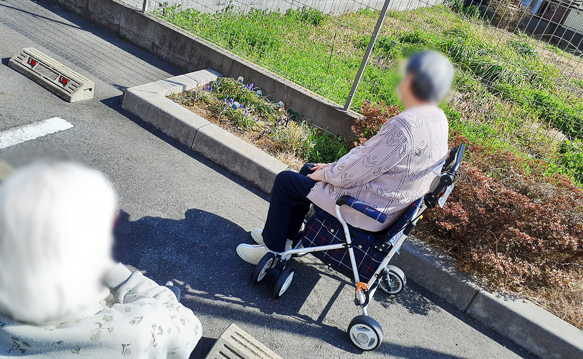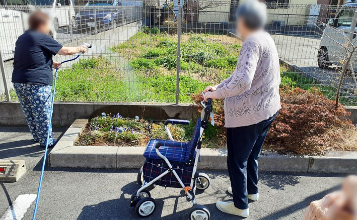 うれしくてうれしくて園芸部員全員集合! フェンス越しに隣家の花にも水やりしちゃいました(*^_^*)