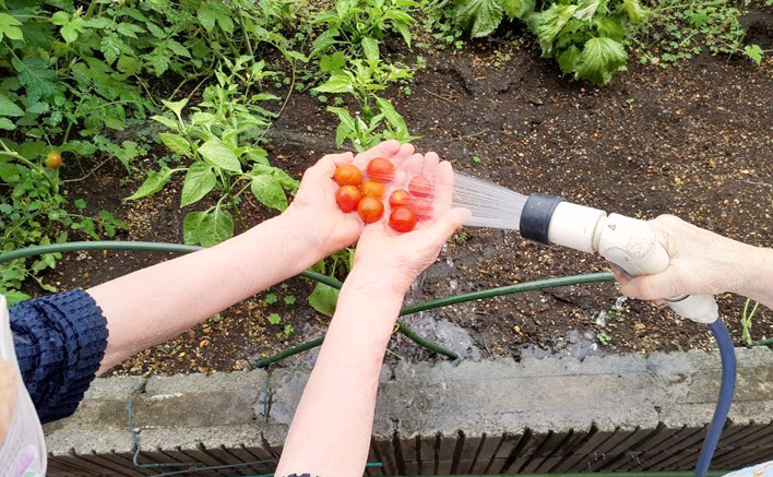 ミニトマトが赤くなってきたので 園芸部員だけで、こっそり収穫&味見しました。