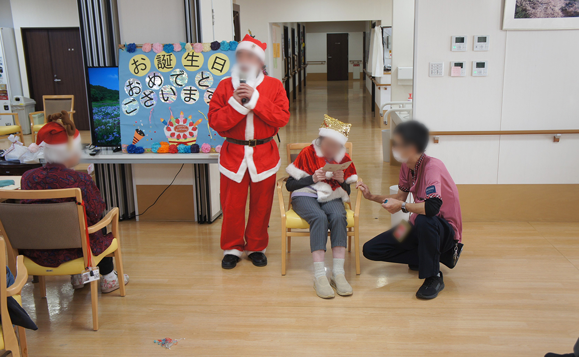 入居者様も職員もサンタさん・トナカイさんに変装し、 クリスマスソングを歌ったり… 景品争奪じゃんけん大会で盛り上がってみたり… 職員サンタが皆様にプレゼントをお渡ししビックリされてみたり… 笑顔あふれるクリスマス会でした‼