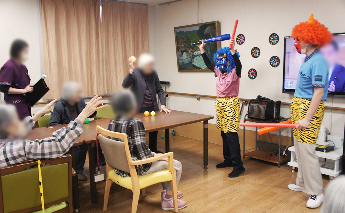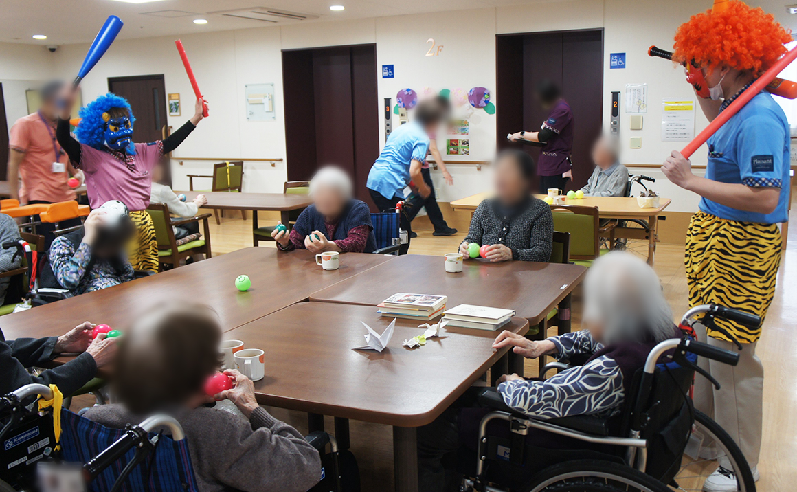 今年も皆さんとても真剣な表情で鬼を退治するための豆まき(ボールで代用)を行いました。 『鬼はそと♪~』と大きな掛け声とともにボールが飛び交っていました。 いつもはおしとやかに過ごされている方も立ち上がって腕を振りかざしていました! 『福はうち♪~』今年も笑顔と福をいっぱい呼び込みました。