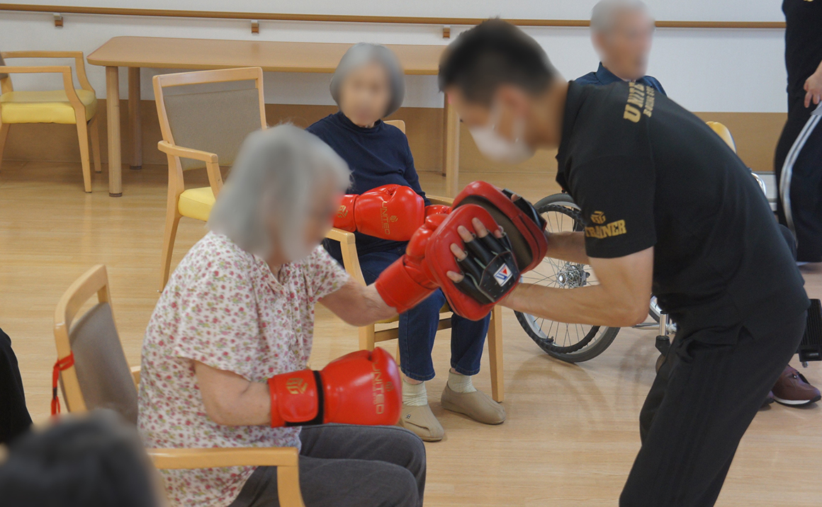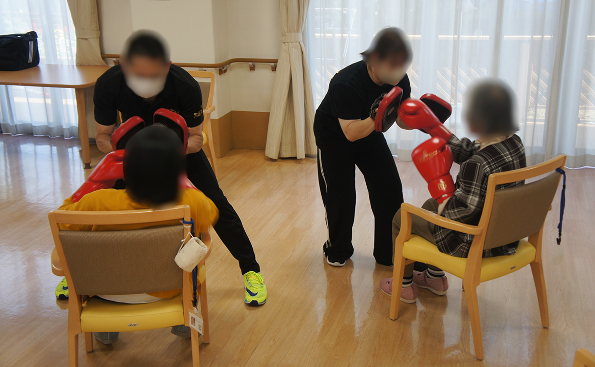 まず準備運動を行った後、グローブを付けて先生の声掛けに入居者様が「ワン・ツー」「ワン・ツー・フック」とミットに向けて打っていきます。