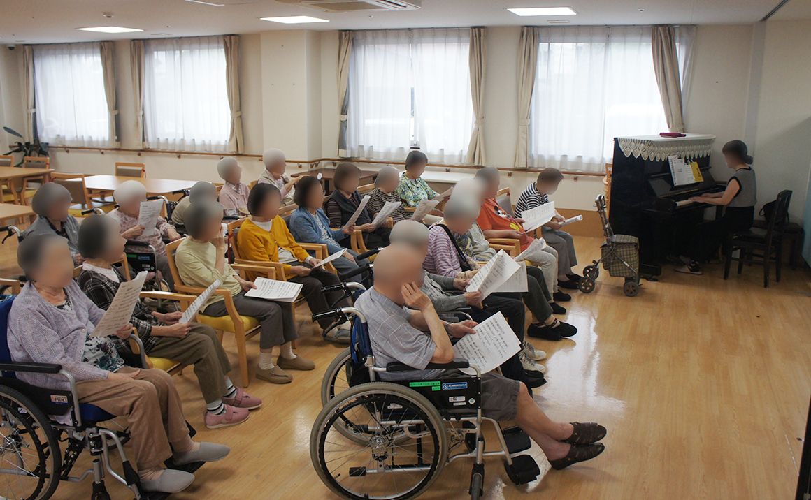 コーラスレクリエーションはピアノを弾いてくれる先生と一緒に皆様で歌うのはもちろん、歌うだけではなく、声を出すことで嚥下も予防できます。