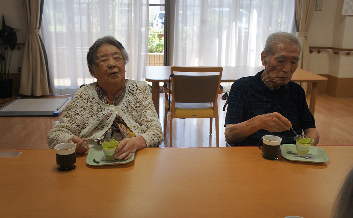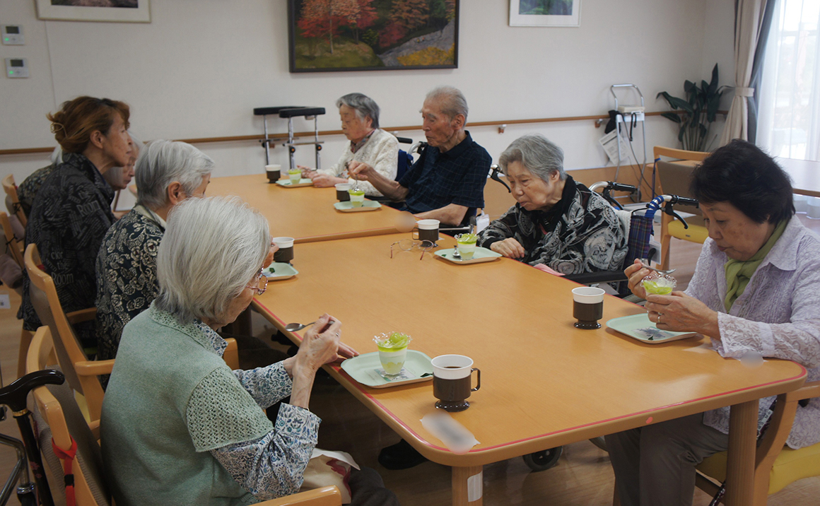 プレザンメゾンさいたま南与野では毎月茶話会を実施しています。 お食事は食堂で皆さんで頂くのですが、ゆっくりじっくりお話をする時間を、交流の場をとケアマネージャーの立案で始まりました。 始めたころは7人~8人程度でしたが美味しいケーキが食べれるとあって人数も増え、月に2回実施しております。 今月のケーキはなんと!シャインマスカットのケーキでした。 皆さん、お話も弾んでほっぺも落ちそうでした。 来月はハロウィンのケーキを探して来ますので是非、奮ってご参加くださいね!