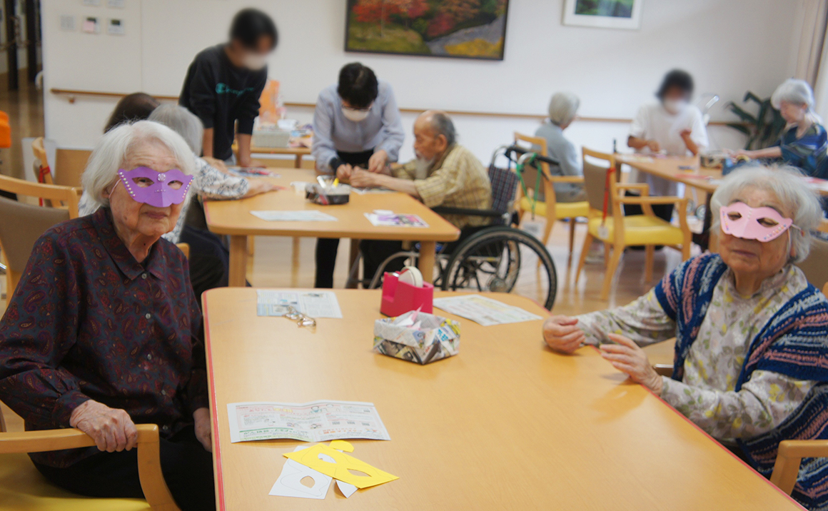 プレザンメゾンさいたま南与野では毎月様々なレクリエーションを実施しています。 その中でも人気のレクリエーション、工作レクのご紹介です。今月はハロウィン🎃が近いので皆さんでおしゃれな仮面を作りました❣ 教育実習の一環として介護体験をされた大学生の皆さんも参加して下さりワイワイ賑やかに作りました。 丹精込めて作った仮面に可愛くデコレーションも施して、出来た仮面を付けて記念撮影をしました。 誰だか?分かりますか?みんなで施設内を回ってお菓子を貰いに出かけましょう! 『トリックオアトリート!』