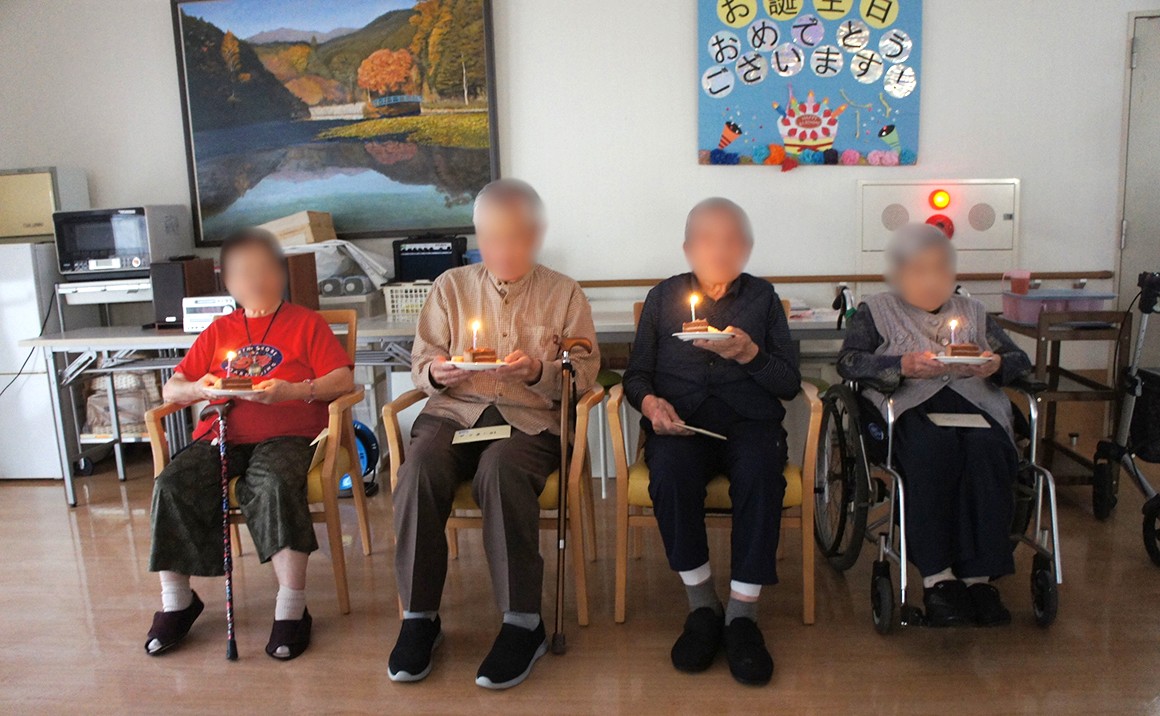 プレザンメゾンさいたま南与野です。 ブログをご覧いただきありがとうございます。 毎月に誕生日会を行っています。今回は10月生まれの方の「誕生日会」を開催しました。 4名の方をみんな一緒にお祝いをしました。笑顔を沢山頂き、職員一同、安らぎを貰いました。 最後には、誕生日ケーキを召し上がり楽しみました♬