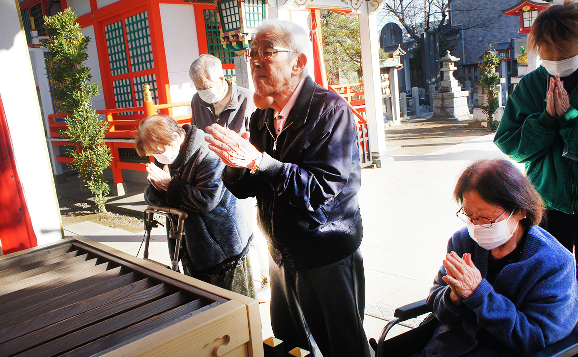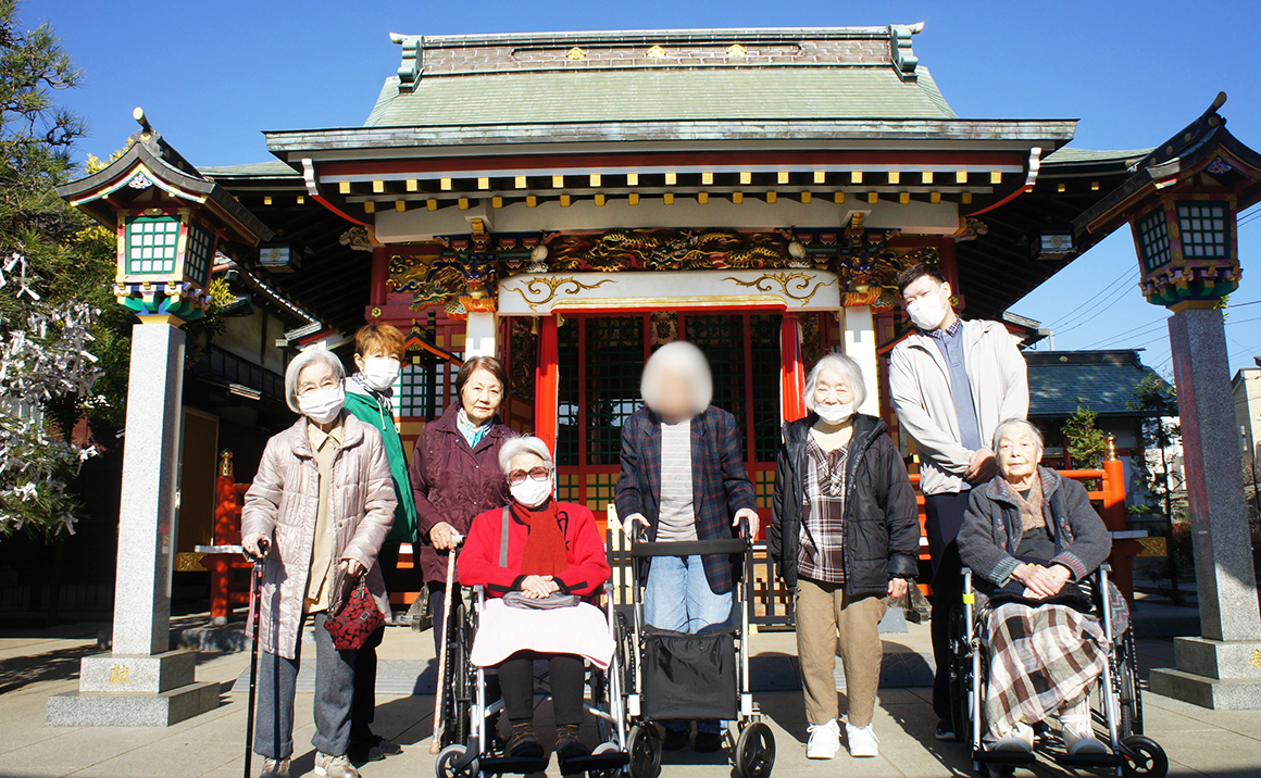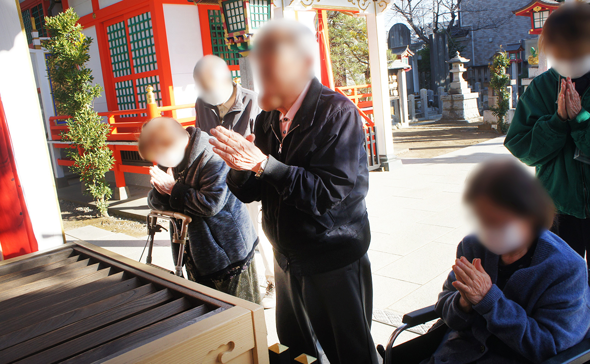 プレザンメゾンさいたま南与野では、施設から車で10分弱にある御嶽神社にドライブも兼ねて初詣に行ってきました! 施設の2台の車で午前中2回、午後2回でなるべく沢山の方に声をお掛けして出かけてきました。 久しぶりのお出かけの方もいらしてドライブを楽しまれ、神社では皆さん真剣にお祈りされていました。 皆さんの日ごろの行いが良いのでお天気も良い日でした。