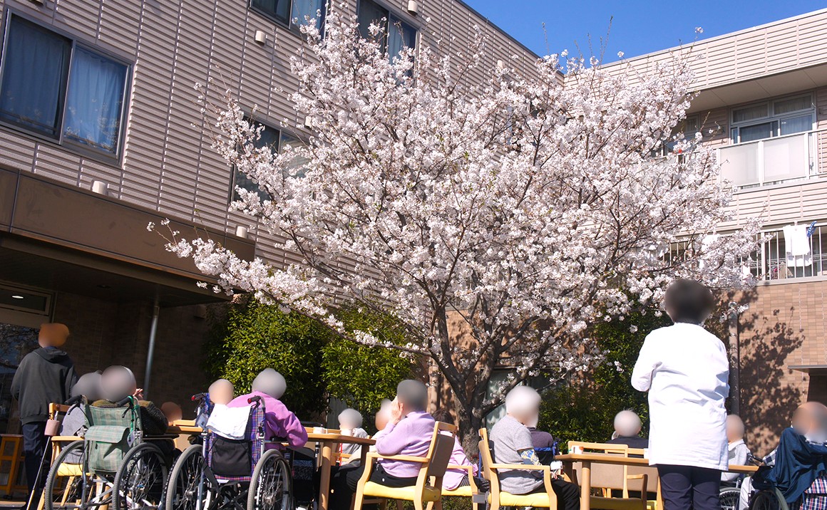 プレザンメゾンさいたま南与野の玄関先には 桜の木があります。 この桜…お寝坊さんで、毎年、近所の桜より1週間ほど遅く咲きます。 遅咲きのおかげで暖かい中でお花見が出来るのです! 入居者思いの桜さん💕 今年も玄関先にテーブルを出して、皆様揃って桜の下で「おやつの会」を開催しました。 桜の花びらがヒラヒラ舞う中で「今年も見られた✨」「去年よりもキレイだねぇ!」… 笑顔いっぱいのお茶会となりました。 また来年も一緒に見ましょうね‼