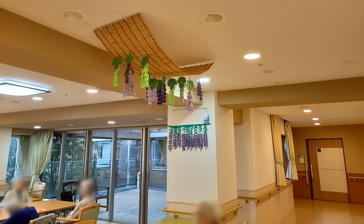 職員主体となって作り方を入居者様に伝授しながら作成に取り組み、 教えた後は入居者様自ら時間を見つけては折り紙を折ったり、ハサミで切ったりと 協力体制バッチリで素敵な作品が完成しました。 今から冬に何を作成しようかと入居者様と職員で話をしています。 冬の作品も乞うご期待!!