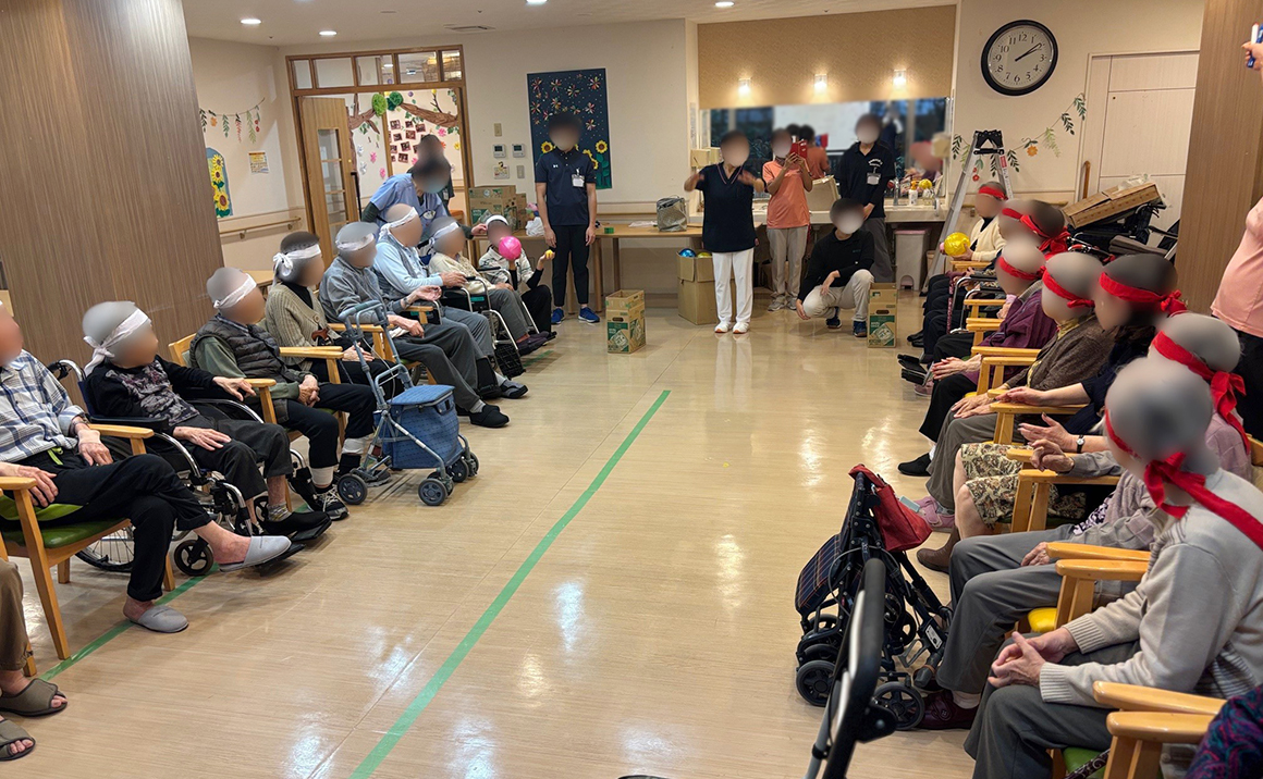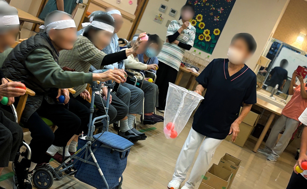 赤組・白組に分かれてミニ運動会を開催しました。 玉入れ、ペットボトル倒し、ボールリレーを行いました。 一つ一つ工夫し入居者様が出来る簡単な競技を職員が考え、入居者様はとても楽しんで参加されており、 介護体験で来ていた学生が盛り上げてくれて楽しいひと時で笑顔が溢れていました!