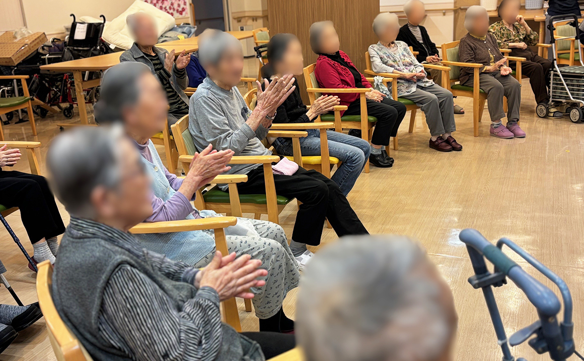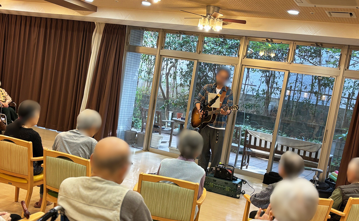 待ちに待った小久保隼さんによるコンサート! 入居者様は隼さんの歌声に聞きほれていました。 手を叩いたり、一緒に歌ったり、踊っていたりと楽しげでアンコールもあり… 1時間半入居者様は疲れもせず聞いていました。 とても楽しかったようです!!