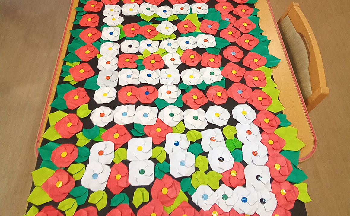 椿の花を折り、模造紙に貼り付けました。