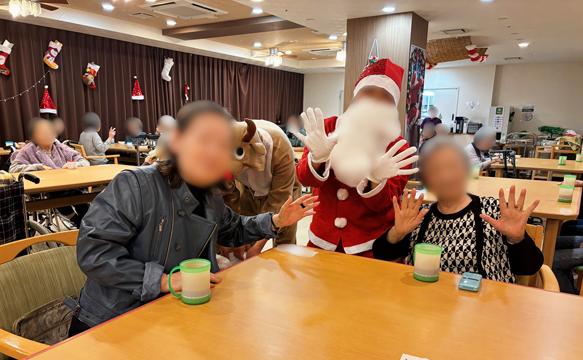 クリスマス会を行いました! 厨房内でケーキを可愛くトッピングしてもらいとても美味しそうですね! 無我夢中で頬張り召し上がっていました。 そしてサンタさんからプレゼントをもらい入居者様大喜び!!楽しい1日となりました!!