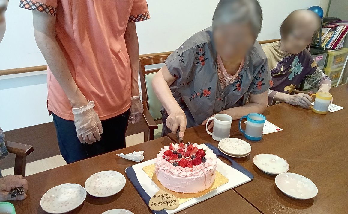 5/11は母の日でした。 日頃、料理作りや洗濯物畳みなど、一緒におこなってくださっている感謝をこめて カーネーションと職員の手書きのメッセージカードをプレゼントしました。 おやつには、笹塚ではおいしいと評判のケーキ屋さんの母の日限定のかわいいケーキを 召し上がっていただきました。