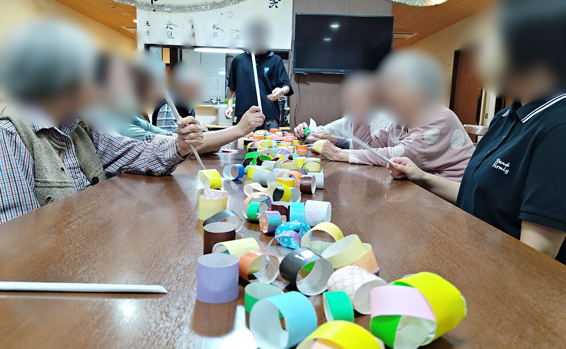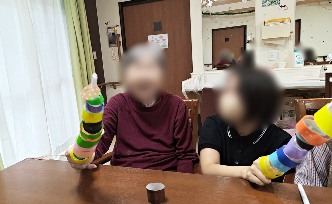 たのしい家宇奈根では11月も介護体験の学生さんが来てご利用者様と一緒に過ごしていただきました。 そんな日常での学生さんとのレクリエーションの様子をご紹介します。 今回のレクリエーションは棒に手作りの輪っかをどれぐらい入れられるかを競うゲームでした! 学生さんの応援の声の元、ご利用者の皆様も意気揚々と参加されており、最後には大きな拍手で大盛り上がりでした!