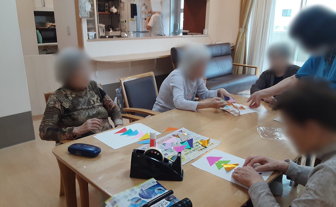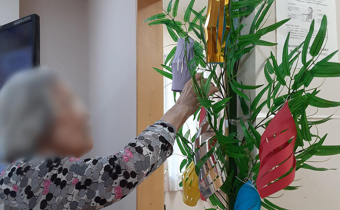 7月のイベントは「七夕祭り」でした。 飾りつけの作成を手伝っていただいたり、ご自身の願いを短冊に書いて笹につるして頂き、たのしい雰囲気で過ごされていました。 「いつまでも健康でいたい」 「皆さんと楽しく過ごしたい」など願いを書かれていました。 皆様のお願い事が叶いますように・・・。