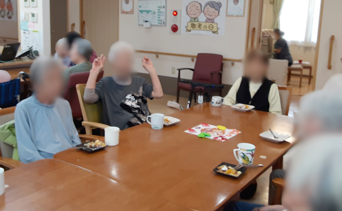 9月のイベントは「敬老会」でした。 上下階の利用者様に集まっていただき、皆さんでおやつのホットケーキを作り召し上がっていただきました。 カラオケの機会で歌を流して、たのしい雰囲気で過ごして頂きました。 来年も皆さんで元気に集まれるように過ごして頂きたいです。