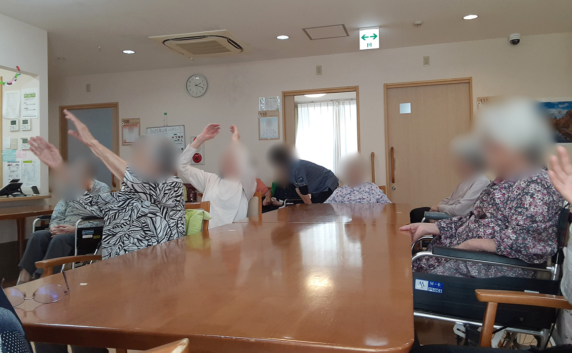 1階と2階の入居者様みんなで集まって体操をしたり歌を歌って体を動かしていただきました。