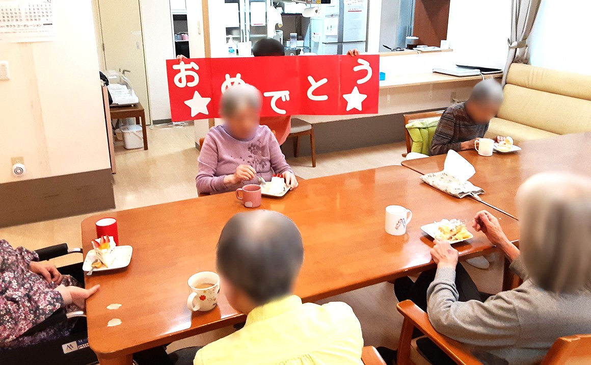 12月17日と18日に誕生日の入居者様がいたので合同で誕生日会を開催しました。 皆様でお祝いをしてケーキを食べて楽しまれました。