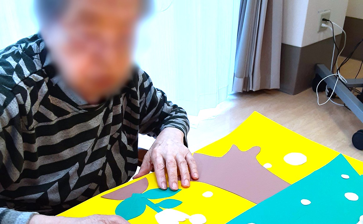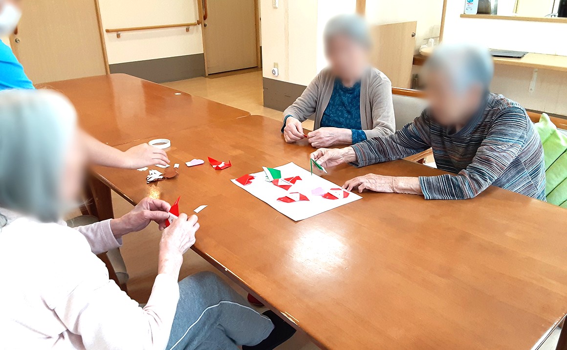 別の日にはクリスマス会の準備を手伝っていただきました。 一緒に折り紙を折りながらプレゼント何がいいかなと談笑されてました。