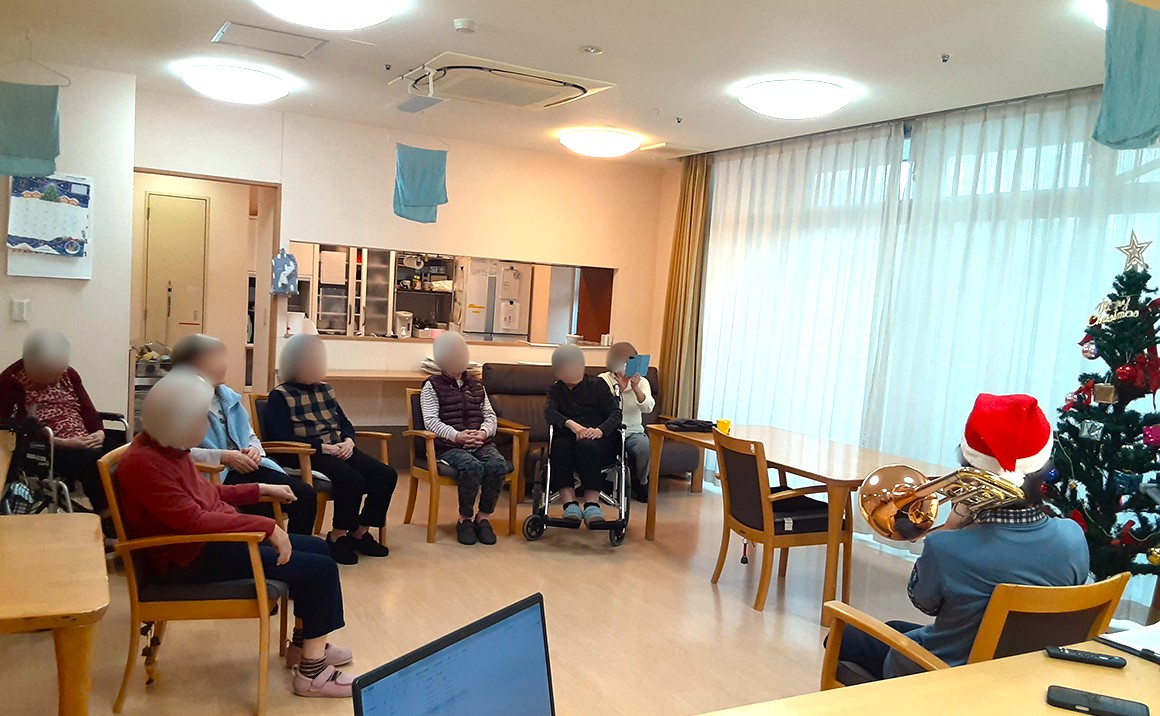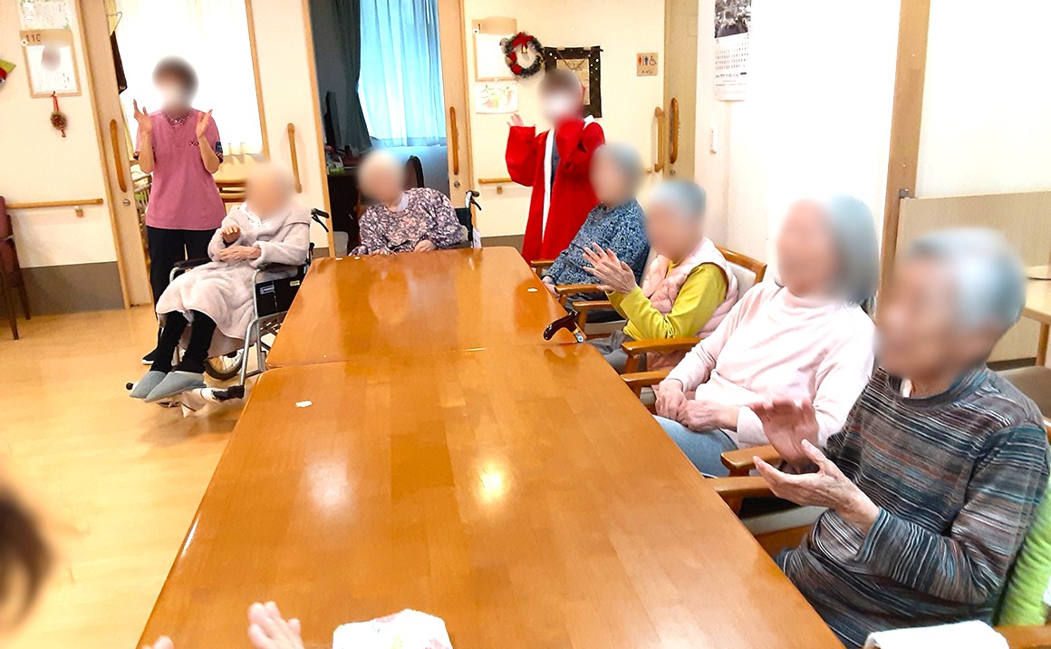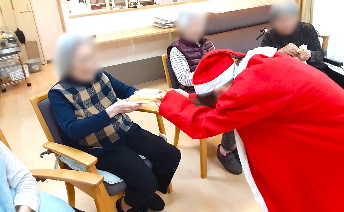 本日は「クリスマス会」でした。 スタッフがサンタクロースに仮装しプレゼントをお渡ししました。 その後、スタッフによるクリスマスコンサートを開催し、歌ったり聴いたりし楽しんでいただきました。 ~来年もこのような楽しい時間を過ごせる様にお願いします~