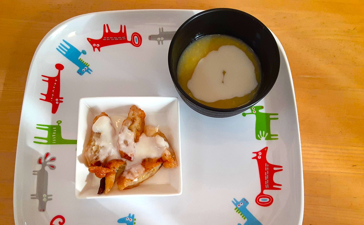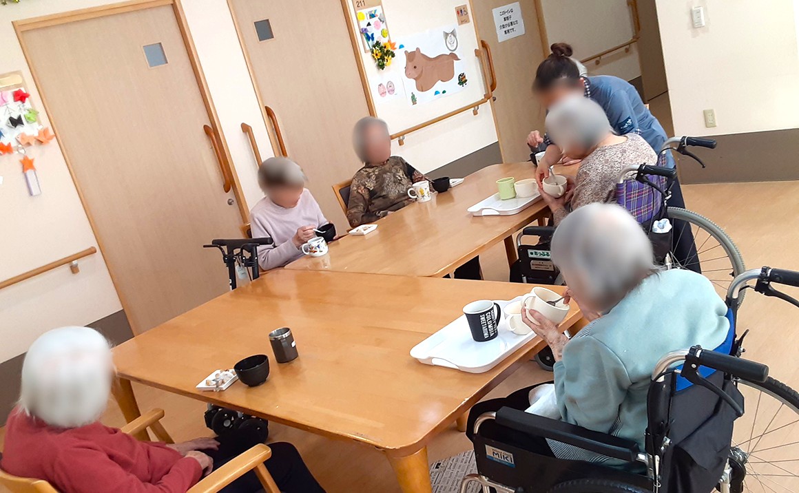 この日は、ベトナム人スタッフに自国のおやつを作ってもらい利用者様に召し上がって頂きました。 ベトナム語で「バインチュオイ」、バナナを擦り、油で揚げたもの(写真左側)と、「チェーダウサイン」、小豆ではなく、青豆で作るぜんざい(写真右側)を用意してもらいました。 どちらも甘くて美味しかったと利用者様に喜んでもらえました。違う文化を味わえるいい会になりました。