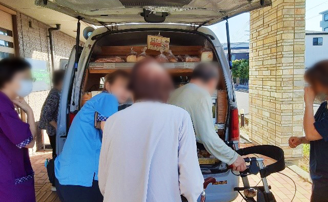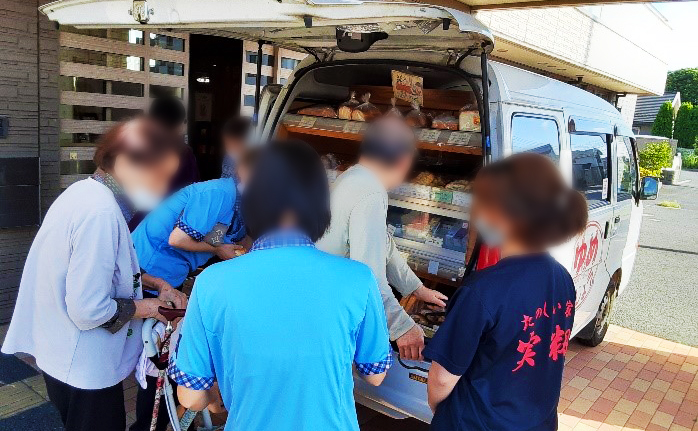 「甘いのがいい?」「しょっぱいの?」と言いながら利用者様も職員もパンを選んでいます。