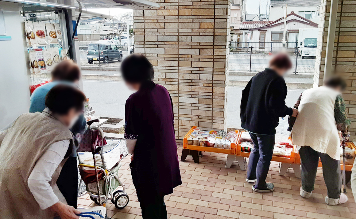 2/17にローソン移動販売が来ました!! この日は風も強く、パラパラと雨も降り始めていました。 そんな中でも沢山の利用者様が来て、お買い物を楽しまれていました( ´∀` ) 「今部屋におやつがあるからいらないんだけどね~」と仰っていた方も、実際売っているものを見ると「買っちゃった笑」と笑われていました♡