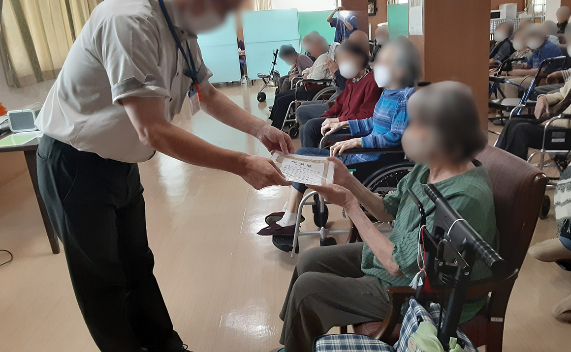 9月15日は敬老の日でした。皆様、おめでとうございます! プレザンメゾン習志野実籾では、前日の14日(日)に「敬老会」を行いました。 傘寿2名、米寿4名、卒寿5名、白寿3名、百寿2名、賀寿2名の計18名の方をお祝いさせて頂きました。 ハーモニカ演奏のボランティアと職員による詩吟を披露し、皆様楽しまれておりました、また、皆様に職員の手作りお守りをお配りしました。 お守りの中には手作りの七福神がちゃんと入っているんですよ~(笑) 皆様がいつまでもお元気で笑顔でいられますように・・・☆彡
