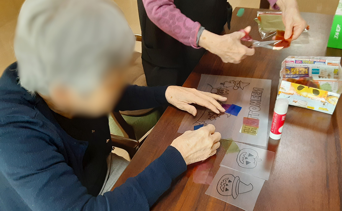 10月31日でのレクリエーションの様子です。 プレザンメゾン習志野実籾には手先が器用な職員が多いです。 今回はハロウィンの「ステンドグラスアート」をご利用者と一緒に作成しました! 細かい作業でも、器用にハサミとノリを使っておられ驚きました👀!! またこんな機会を作りたいと思います♬
