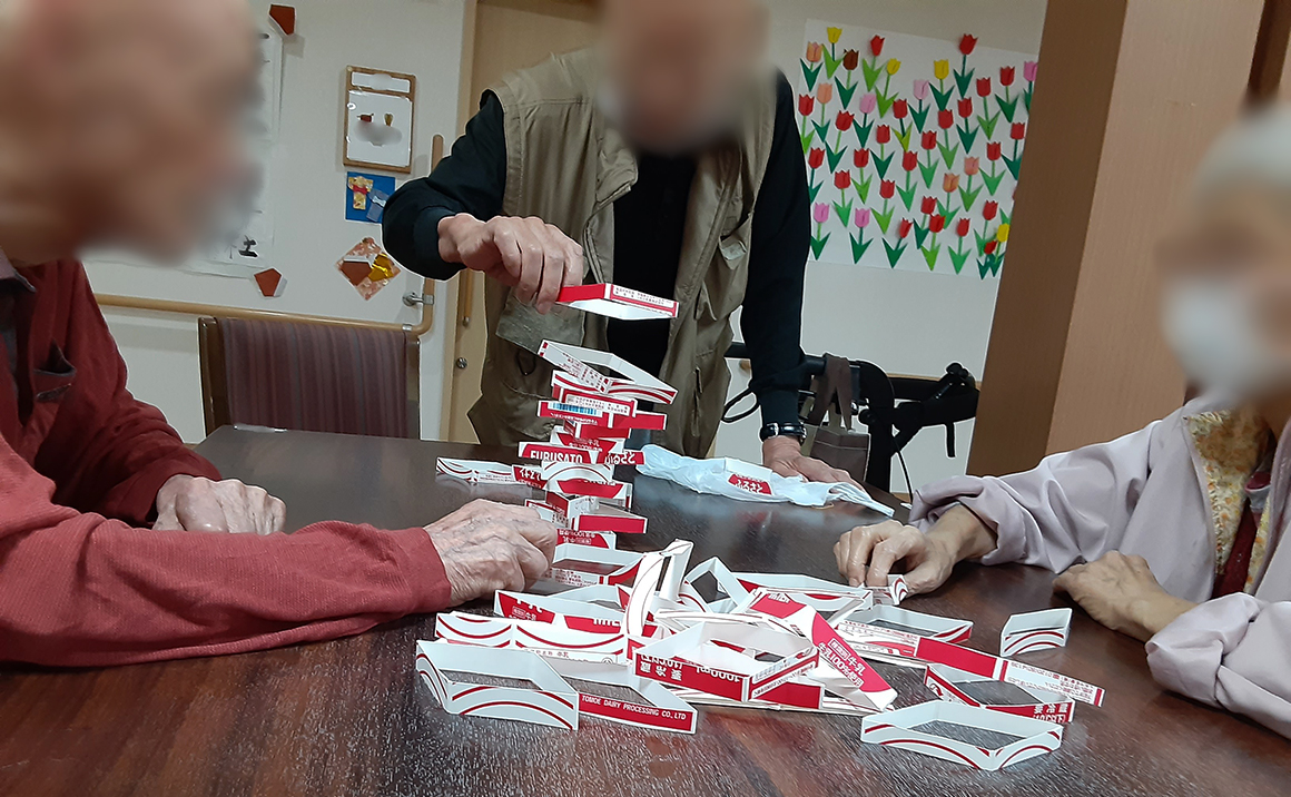 プレザンメゾン習志野実籾での日々のレクリエーションの様子です。 今回は職員手作り、牛乳パックを細かく切り、それを積み重ねていくゲームをしました! 倒した人が負け!です。皆さんとても真剣で、慎重に」積み重ねていました。 普段こんなに集中した表情はなかなか見れません(笑)!! 倒れてしまった時はみんな「あ゛ぁああああ~!!!」と大笑い!!