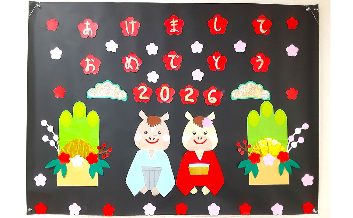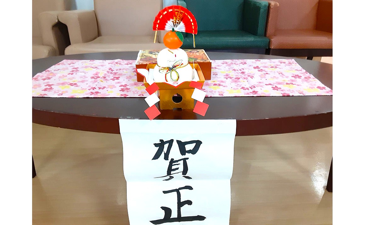 プレザンメゾン習志野実籾の正月の飾りです。職員の手作りや書道が得意なご利用者様に年末に書いていただいたものです(*^。^*)