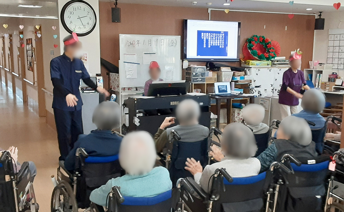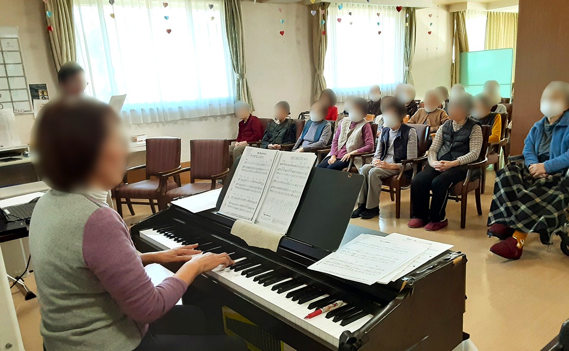 プレザンメゾン習志野実籾の「歌声広場」の様子です(*´ω`*) ご利用者の娘様がボランティアでピアノ演奏をしてくださり、みんなで歌をうたいます♬皆さん本当に歌が好きでお上手なんです(*^。^*) 「りんごのうた」の時は、頭にリンゴを被りうたいました( *´艸`)
