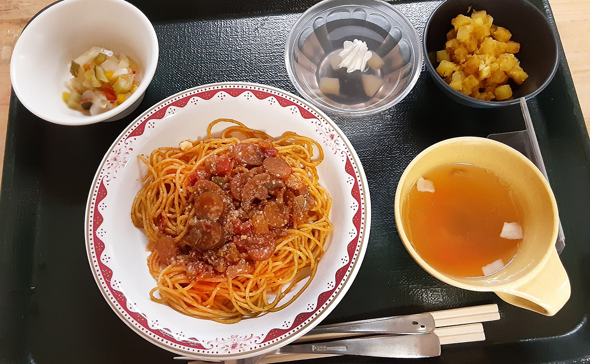 ★メニュー★ ・ナポリタン ・ジャガイモのカレー炒め ・彩野菜のマリネ ・コンソメスープ